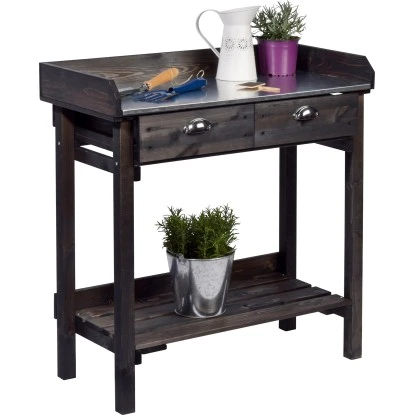 Ein praktischer Helfer im Garten: Dieser schwarze Pflanztisch mit zwei praktischen Schubladen ist ein vielseitiger und robuster Arbeitsplatz für die Gartenarbeit. Der Pflanztisch besteht aus wetterfest lasiertem Fichtenholz (Picea abies, Hauptholzart), das Stabilität garantiert. Die Ablage unter der verzinkten Arbeitsfläche bietet Platz für Gartenwerkzeuge und Gießkannen. So haben Sie die nötigen Utensilien immer griffbereit, wenn Sie auf einer rückenschonenden Arbeitshöhe gärtnern und umtopfen. Der Pflanztisch ist ca. 90 cm x 79 cm x 39 cm(H x B x T) groß. Die Maße der Arbeitsfläche sind ca. 76 x 37,5 cm (B x T).
