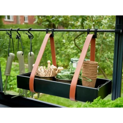 Das Regal gibt es in zwei Größen und es lässt sich einfach an den Profilen des Gewächshauses montieren. Das 2 Sektionen Regal deckt zwei Profile und drei Glassektionen. Das 3 Sektionen Regal deckt 3 Profile und vier Glassektionen.