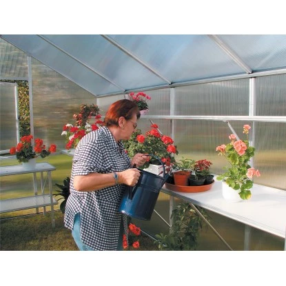 Das praktische KGT Tischgestell ist aus hochwertigem Aluminium gefertigt und sorgt für Ordnung im Gewächshaus. Es eignet sich z. B. zum Ein- und Umtopfen, zur Aussaat und für Arbeiten rund um die Pflanzenpflege. Es verläuft über die gesamte Seitenwand des Gewächshauses. Die hochbruchfesten weißen Kunststoff-Einlegeplatten sind individuell herausnehmbar und leicht zu reinigen. Dank der intelligenten Befestigung am Gewächshaus sind alle tragenden Einrichtungsteile hoch belastbar. Die Tiefe des Tischgestells beträgt ca. 63,5 cm.
