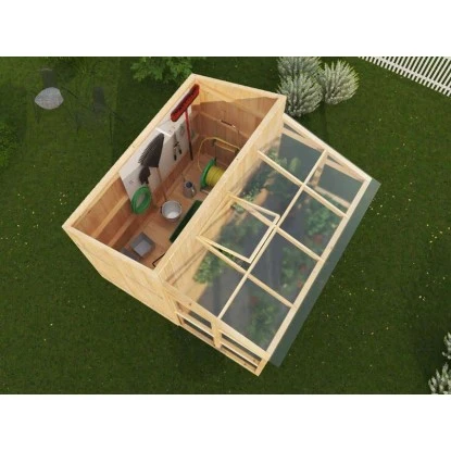 Das Holzhaus ist ca. 7 m² groß, wobei die beiden verschiedenen Hausteile gleich groß sind. Dieses Gewächshaus/Gartenschuppen wird als fertiger Bausatz geliefert, welcher mit Hilfe der Montageanleitung zusammen gebaut werden kann.