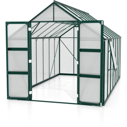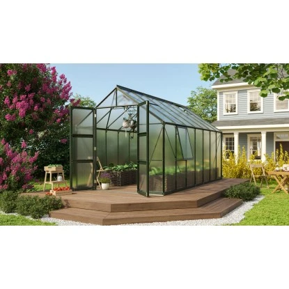 Das Gewächshaus Olymp ist in vier verschiedenen Größen mit Grundflächen von 6,7 bis 11,5 Quadratmetern und in drei verschiedenen Farben erhältlich.