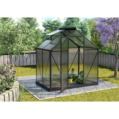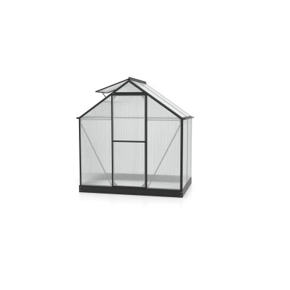 Die Montagetechnik wurde verändert und deutlich verbessert, sodass die Rahmen aus Aluminium einfach und bequem mit 4 oder 6 mm Hohlkammerplatten aus Polycarbonat (PC), aber auch mit kristallklarem Sicherheitsglas (ESG) bestückt werden können. Die Dachfensterverglasung hat bei Hohlkammerplatten-Modellen immer eine Stärke von 4 mm. Das Gewächshaus hat eine neuartige und sehr einfache Einschubtechnik, bei der die Scheiben auf ganzer Länge von abgeflachten Designprofilen eingefasst bzw. umrahmt werden. Daher zeichnet es sich auch ohne zusätzliche Windsicherungssysteme durch hohe Windstabilität aus. Die milchige Oberfläche der Hohlkammerplatten bricht das Licht, sodass meist kein Abschattieren notwendig ist. Die Glasmodelle hingegen bestechen durch ihre klassische Optik. Es ist in fünf verschiedenen Größen mit den Grundflächen von 2,6 bis 7,5 m² und in drei Farben erhältlich: In Aluminium eloxiert sowie in Smaragd und in Schwarz pulverbeschichtet. Das Triton wird inklusive Stahlfundament geliefert. Je nach Modell ist das Triton mit einem oder mit zwei Dachfenstern ausgestattet, die eine gute Be- und Entlüftung garantieren. Die Regenrinnen gehören auch zur Standardausstattung. Die Tür kann wahlweise als praktische Schiebe- oder Schwingtür montiert werden. Sie hat eine Breite von 60 cm und eine Höhe von 164 Gewächshausset beinhaltet passendes Zubehör.
